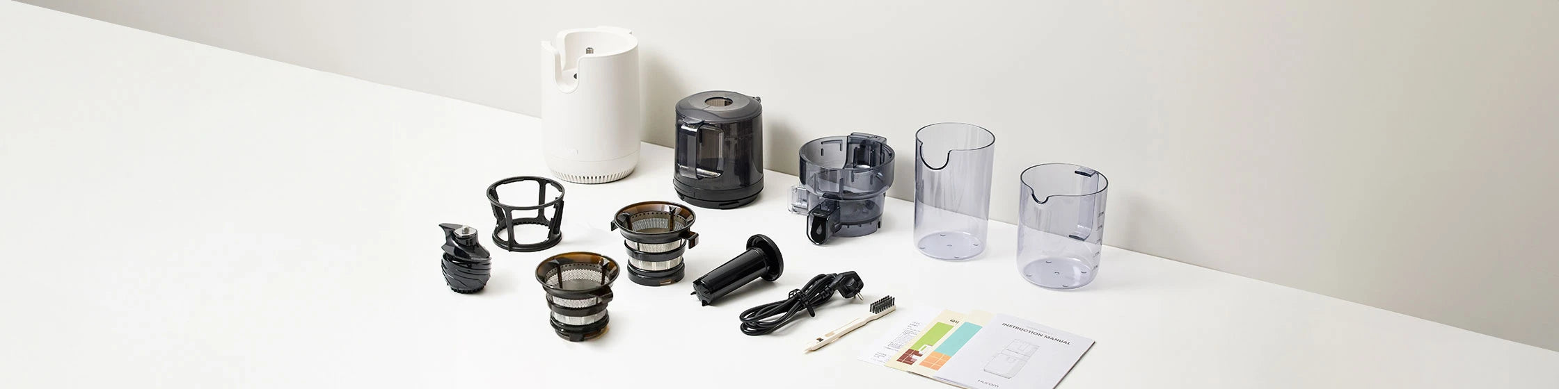 Materials | - Body: ABS - Chamber: Tritan (PCT) - Hopper: MABS - Squeezing Screw: PEI Ultem - Fine/Coarse Strainer: PEI Ultem + SUS304 - Large seeds like peach pits should be removed before going into the juicer. |