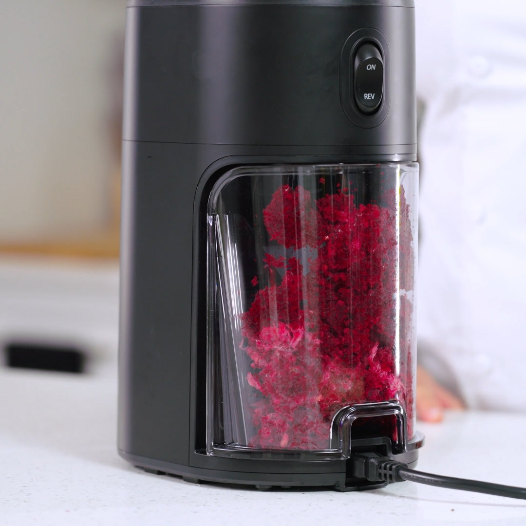 تم تصميم H400 ليكون بسيطًا، فهو لا يتطلب سوى ثلاثة أجزاء للتنظيف. استمتع بالتجميع والتفكيك السريع، مما يجعل عملية العصير خالية من المتاعب من البداية إلى النهاية. يعمل تصميمه المبتكر للمسمار الخالي من المصفاة على إنتاج عصير غني بالعناصر الغذائية قليل اللب دون تراكم المعادن - البقايا الجافة التي تتراكم على المصافي التقليدية بمرور الوقت.